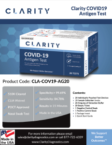 Clarity Diagnostics is thrilled to announce the launch of a COVID-19 Antigen Rapid Test—510(k) Cleared, CLIA-Waived, and Made in the USA. Based on market demand, this test provides reliable, 15-minute results and is stocked now in our Deerfield Beach warehouse. Click below for more details!