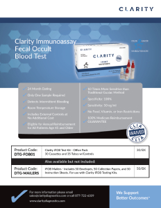 Clarity’s Fecal Occult Blood test is a one-step immunological screening tool that can assist in the detection of gastrointestinal diseases, including colon cancer. The test has several advantages over traditional guaiac assay methods, including no dietary restrictions and the ability to detect intermittent bleeding. Each box of DTG-FOB01 contains 30 test cassettes, 35 buffer tubes, a set of controls, and a product insert. The DTG-MAILERS includes 50 envelopes, 50 collection papers, and 50 instruction sheets.