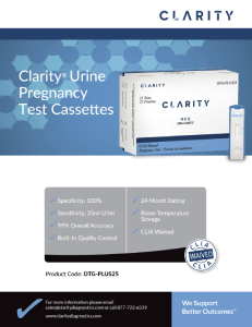 Clarity’s DTG-PLUS25 pregnancy test cassette has both 99% overall accuracy and specificity of 100%. Results within as little as 5 minutes. Each box includes 25 cassettes and a product insert. The DTG-UHCTLS hCG controls are sold separately.