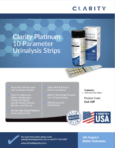 Our CLA-10P urinalysis strips are for use only with the Clarity Platinum are more than 99% accurate, and test for Leukocytes, Nitrite, Urobilinogen, Protein, pH, Blood, Specific Gravity, Ketone, Bilirubin, and Glucose. Each strip includes and IR band to ensure compliance and our lid-lock technology minimizes the strips’ exposure to air and humidity.