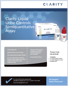 The Clarity Urocheck Liquid Controls are for use with the Clarity Urocheck brand urine analyzers and reagent strips. They ship in 3 sets of 10 mL easy-to-use dropper bottles with color coded caps.